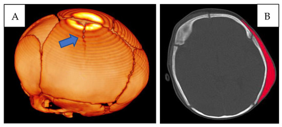 (A) CT skull—3D reconstruction: fracture with a linear course in the left parietal location (blue arrow). (B) CT skull, subgaleal haematoma in the parieto-occipital site (red).