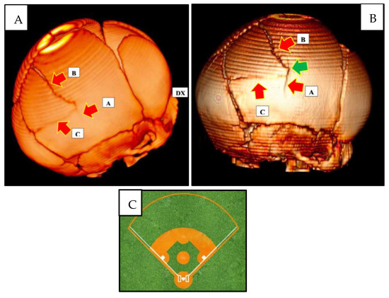 Three-dimensional skull CT reconstruction. (A) The red arrows indicate the three fracture branches: ‘A’ lower branch; ‘B’ upper branch; and ‘C’ posterior branch. ‘DX’ indicates the right side. (B) The red arrows indicate the three fracture branches: ‘A’ lower branch; ‘B’ upper branch, and ‘C’ posterior branch. The green arrow indicates the point of cranial impact. (C) ‘Baseball diamond’ image.