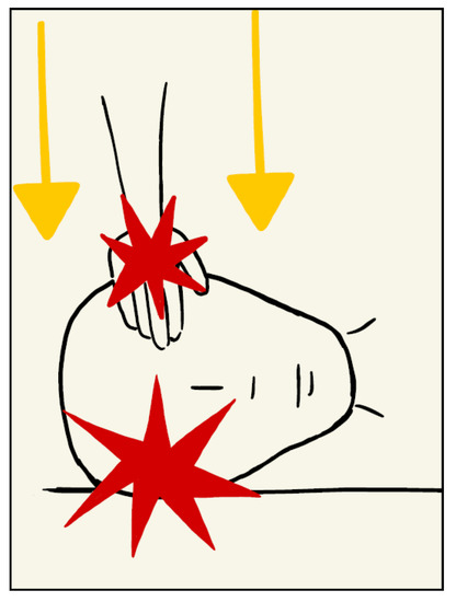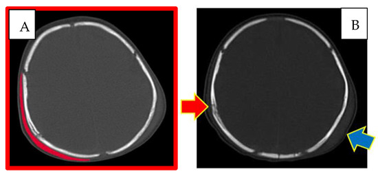 On the other hand, with regard to the spiral fractures of the tibiae and the multiple costal fractures, the presence of bone callus on radiographic images made it possible to define the lesions as non-coincident with cranio-encephalic trauma. In particular, the tibial fractures, due to the particular spiral conformation, were not correlated with direct traumatism but due to a mechanism of extreme rotation of each lower limb. The detected rib fractures, located at the level of the posterior arch of two adjacent ribs, are also typically frequent in cases of child abuse [38]. For all these reasons, the authors identify the pathogenetic mechanism on the basis of the head injury observed in the child as a case of ‘Compressed Baby Head’ (Figure 7).