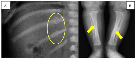 (A) Rib fractures with reparative phenomena (yellow circle). (B) Diaphyseal tibial spiral fractures (yellow arrows).