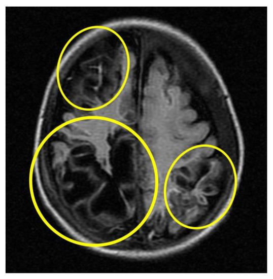 MRI cortical atrophy and cystic evolution of the brain parenchyma (circles in yellow).