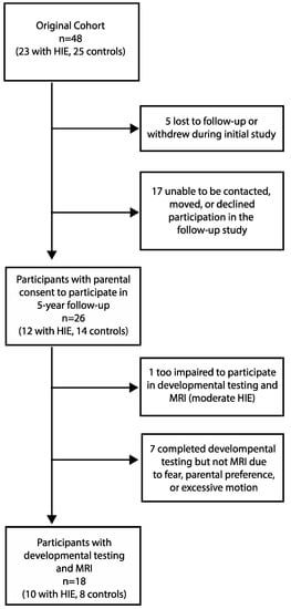 Parental consent for participation was obtained from 26 subjects in this follow-up study (12 from the group with HIE and 14 from the control group). Of the original 48 newborn participants, 5 were lost to follow-up or dropped out during the initial 12-month infant study, and 17 were unable to be contacted or declined participation at 5 years, leaving 26 participants at 5 years. Adequate MRI scans and developmental testing were obtained in 10/12 children with a history of HIE (two participants without MRI data: one with motion artifact, one child refused MRI) and 8/14 controls (six participants without MRI data due to parent/participant consenting/assenting to developmental testing only) who participated at 5 years (Figure 1, Flowchart of participation). “Adequate” MRI was defined as structural MRI data that passed the Freesurfer segmentation process and a visual inspection by research staff. There was no statistically significant difference in the participant characteristics between those who returned for a 5-year follow-up and those who did not, both overall and within each group. Though motor function was not formally assessed, all returning participants were ambulatory and without a reported diagnosis of cerebral palsy. All participants with HIE had been referred to the state’s early intervention program and the NICU Follow-Up Clinic associated with their NICU at the time of hospital discharge. We did not have access to data regarding the frequency of follow-up or details of interventions.
