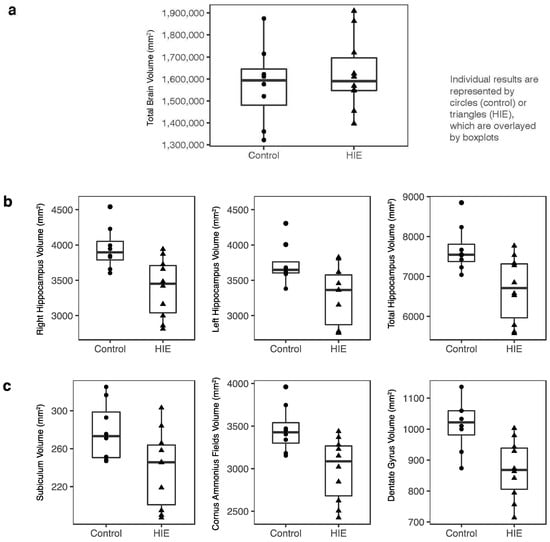 Brain volume comparisons between groups. Individual results are represented by dots or triangles, which are overlayed by boxplots. (a) Comparison of total brain volume at 5 years between control and HIE groups; there was no significant difference. (b) Hippocampal volumes divided into left, right, and bilateral hippocampus, and (c) subregions. The hippocampal volumes for the HIE group were significantly smaller than the control group in all subregions shown in (b,c) (p < 0.05).