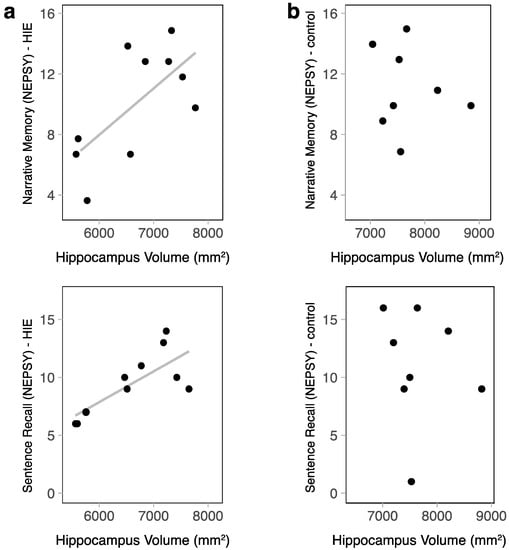 The relationship between hippocampal volume and memory function was assessed via a standardized psychometric assessment using NEPSY-II subtests. (a) In the HIE group, narrative memory scores increased as the hippocampal volume increased (r = 0.5, p = 0.14), and sentence recall scores increased as hippocampal volume increased (r = 0.66, p = 0.038). (b) In the control group, there was no relationship between hippocampal size and memory function.