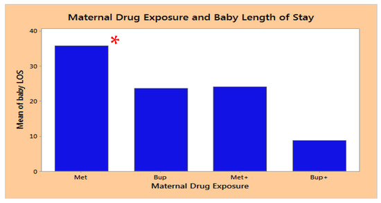 Length of Stay of Neonates with Prenatal Exposure to Methadone vs. Buprenorphine. *—significantly higher LOS in the Met alone group compared to the other groups, p < 0.05. Met—methadone exposure alone, Bup—buprenorphine exposure alone, Met+—methadone in conjunction with other drugs or opiates, and Bup+—buprenorphine in conjunction with other drugs.