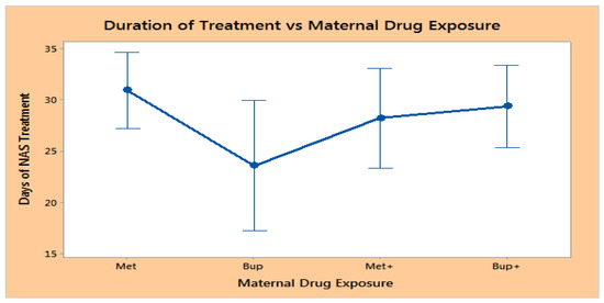 There was not difference in the mean duration of opiate treatment days (with confidence intervals using SD) for neonates who underwent NAS treatment for all neonates exposed to methadone or buprenorphine in utero as seen in Figure 2. The LOT was as follows: Met (methadone exposure alone), 30.9 days (95% CI 27.2–34.6); Bup (buprenorphine exposure alone), 23.6 days (95% CI 17.2–29.9); Met+ (those who took methadone in conjunction with other drugs, opiates or other), 28.2 days (95% CI 23.3–33.4); and Bup+ (took buprenorphine in conjunction with other drugs), 29.3 days (95% CI 25.3–33.4). p = 0.11 (Figure 2).