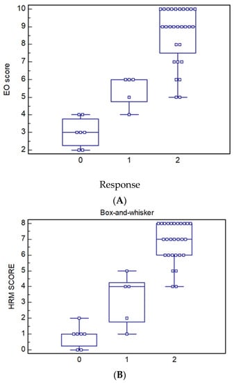 Statistical analysis of the quantitative and qualitative data, including descriptive statistics, was performed for all items. The Shapiro–Wilk test was used to evaluate the normality of the distribution of the quantitative data. Continuous data were shown as mean ± standard deviation (SD). The Pearson’s chi-square test and Fisher exact test were used for frequency analysis. The univariate analysis of variance (ANOVA) was used to compare the mean differences in continuous variables between the different patient groups or different patient subgroups, and post hoc analysis with the Tukey test was used to determine whether there were pairwise intragroup differences. Moreover, a multinomial regression analysis was performed to evaluate the relationship between BM response and HRM and EO data.