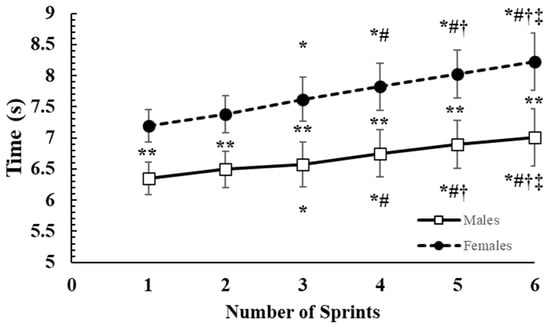 Sprint times during the repeated shuttle-sprint running test. **: p < 0.01 difference between boys and girls; *: p < 0.05 difference from 1st sprint; #: p < 0.05 difference from 2nd sprint; †: p < 0.05 difference from 3rd sprint; ‡: p < 0.05 difference from 4th sprint.