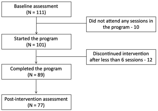 From 111 participants who initially registered for the program and filled in questionnaires at baseline, 101 participants started the program, 89 (88%) completed the program, and 77 filled in the post-assessment questionnaires (86.5% of participants who completed the program) (see Figure 1).