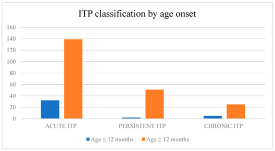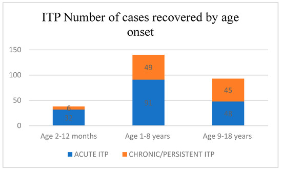 Immune thrombocytopenia (ITP) in children is an acute autoimmune blood disorder, characterized by a decrease in platelets below 100 × 109/L without other secondary causes of thrombocytopenia. The incidence of childhood immune thrombocytopenia varies between 1.6 and 6 per 100,000 children [1]. Clinical signs of ITP include: petechiae, ecchymoses, hematomas, epistaxis, and hematuria. In severe cases, intracranial hemorrhage (the most serious complication, but also the rarest, occurring ~0.5% in children and 1.5% in adults), gastrointestinal hemorrhage, and genito-urinary hemorrhage may occur [2]. The frequency of severe bleeding episodes is approximately 1 in 800 cases (0.2–0.9% of all cases) [3]. Most children with ITP achieve spontaneous remission in the first 6 months; 40% of children present the persistent form of the disease (the duration of thrombocytopenia lasts between 3 and 12 months, and includes patients who do not show spontaneous remission or have not obtained a complete response to therapy) and 10–20% develop the chronic form (the presence of thrombocytopenia for at least 12 months) [4]. Chronic ITP is defined as the persistence of thrombocytopenia with platelet values < 100 × 109/L for 12 months [1,5]. The scope of this retrospective study is to describe the clinical characteristics of ITP at onset; to evaluate the evolution, treatment options, and complications; and to determine the risk and prognostic factors in immune thrombocytopenia in children.