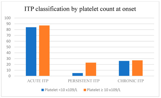 Patients with a history of infection showed a lower risk of chronicity. The mean platelet count at baseline for patients with the acute form of the disease was 9.4 +/− 12.4 × 109/L, compared to a mean value of 17.5 +/− 19.4 × 109/L for patients with the chronic form of the disease [19].