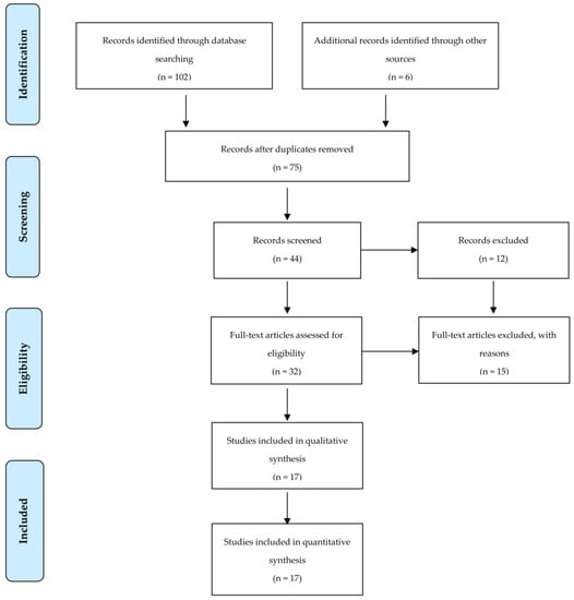 One hundred and two articles were identified from the database search, with an additional six articles identified through reference lists. After removing duplicates and eliminating articles based on title and abstract screening, forty-six studies remained. An evaluation of the remaining forty-six studies was conducted independently by two researchers. Following the final screening process, seventeen studies were included in the systematic review (Table 1). Details of the study selection process are presented in Figure 1.
