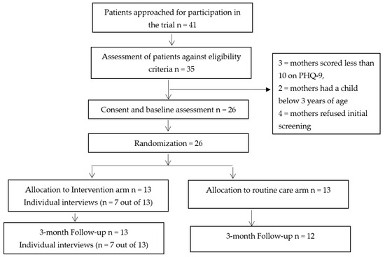 During 5 months of recruitment (from July to December 2019), CHWs successfully screened 35 participants from two recruiting centres. Of these, 26 (74.3%) mothers met the eligibility criteria and gave informed consent (Figure 1). None of them withdrew their consent; only one participant from the routine care arm had to leave the study as she relocated to another city, resulting in a retention rate of 96%. Participants were able to respond to all questionnaire assessments as evident from the completeness of data. Researcher logs suggested no issues with responding to the multiple choice measures.