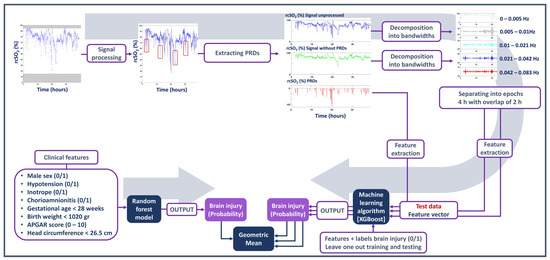 To test if clinical information could enhance the predictability of detecting brain injury, the rcSO2 model and clinical model were combined using a late-stage fusion approach. Specifically, the probabilities generated from the rcSO2 model were combined with the probability of the clinical-feature model using the geometric mean. The same approach was applied to combining the SpO2 and clinical models. All the steps taken to process the signal, extract the PRDs and features, and utilise the machine learning model are presented in Figure 1.
