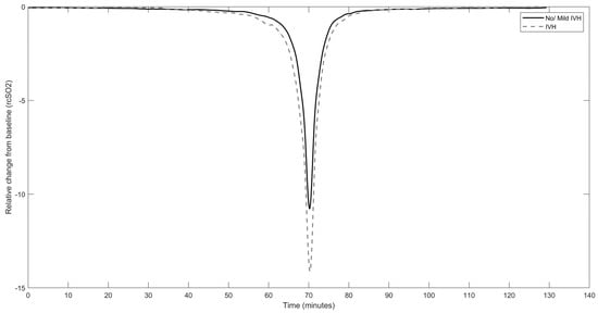 Averaged curve of all rcSO2 PRDs in the intraventricular haemorrhage group (dashed line) vs. no/mild intraventricular haemorrhage group (solid line); X-axis indicates the time in minutes when the grand average of rcSO2 PRDs starts to deviate from baseline, reaches the nadir, and increases to baseline again.