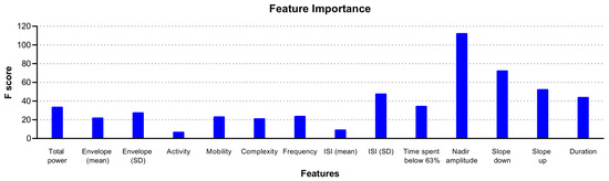 Estimating feature importance in the rcSO2 PRD model showed that a range of features contributed to the XGBoost model, with the top three features being the mean amplitude and negative and positive slope of the PRDs (Figure 3).