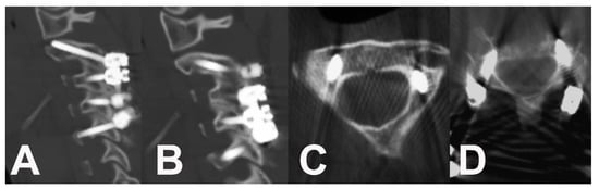 CT scan shows the fusion one year after surgery. (A,B) Sagittal slices of the fused cervical spine from C2 to C5. (C) Axial slice of C2 with transpedicular screw insertion and a high vertebral artery position on the left side. (D) Axial slice of the C5 bilateral transpedicular fixation.
