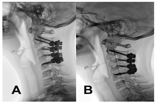 A typical example of chin-on-chest deformity is the dropped head syndrome (DHS) [,,]. This type of severe kyphotic deformity results from the decreased strength of extensor muscles due to different, mostly neuromuscular diseases, such as amyotrophic lateral sclerosis (ALS), Parkinson’s disease, polymyositis, myasthenia gravis, genetic myopathies, motor neuron disease, or post-radiation atrophy [,,]. In cases without a secondary cause, the condition is called the isolated neck extensor myopathy. The incidence of DHS is limited to older adults, usually between 60 and 70 years old. The disease can have a progressive or sudden onset in character []. A review published by Drain et al. identified 129 patients with DHS described in 74 studies []. Cavagnaro et al. published a systematic review of 54 patients treated by surgery []. Cervico-thoracic arthrodesis, usually from C2 to Th3 or Th4, was the most common surgical procedure. Limited fusion without a thoracic spine component resulted in a 71% failure rate. The surgery was performed from a posterior-only approach or as a combined procedure. An anterior approach resulted in dysphagia in 75% []. A completely different surgical strategy for this flexible, severe kyphotic deformity was described by Farshad et al. as occipitopexy []. This correction was based on a ligamentous fixation of the occiput to the upper thoracic spine without fusion. In our case, the electrophysiological evaluation excluded any neuromuscular diseases preoperatively.