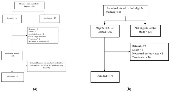 Figure 1a,b illustrates the inclusion process. To check for selection bias, we compared 1 and 5 min Apgar scores and time to ventilation and duration of ventilation between those who completed the MDAT (n = 159) and those not located, those that refused and those that died (n = 66).