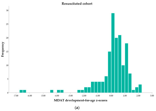 The following supporting information can be downloaded at: https://www.mdpi.com/article/10.3390/children10060957/s1, Table S1: Video log, Table S2: Birth factors in resuscitated infants lost to follow up, Figures S1–S12: Histograms and boxplot for each MDAT domain.