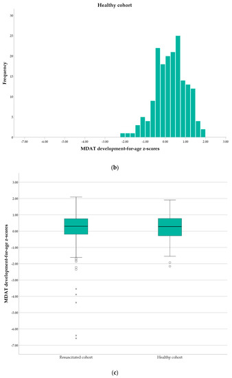 Neurodevelopmental outcomes as the distribution of age-adjusted z-scores of the Malawi Developmental Assessment Tool (MDAT) in the resuscitated cohort (a) and healthy cohort (b). The boxplot (c) demonstrates extreme outliers in the resuscitated cohort. Circles (ο) represent potential outliers within 1.5–3 interquartile ranges (IQR) from the quartile 1. Asterix (*) represents extreme outliers that are more than 3 IQR from the quartile 1.