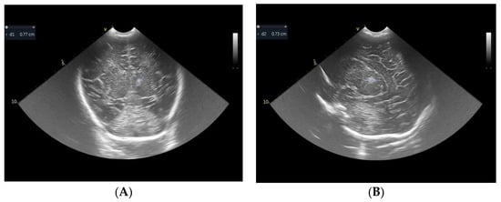 From a clinical point of view, after the 12th day of life, apneic episodes ceased under the previously mentioned therapy (no thrombolytic agents or anticoagulant therapy was given); the ongoing neurological examination during hospitalization did not reveal any pathological signs and the baby was discharged home on the 26th day of life. Serial cranial ultrasounds performed until discharge showed the same abnormal, nonprogressive echogenicity in the thalamic area (Figure 4A,B).