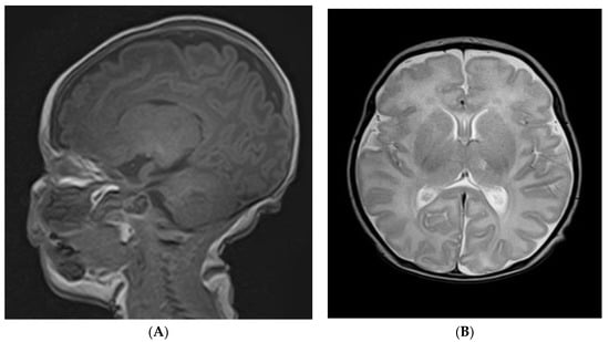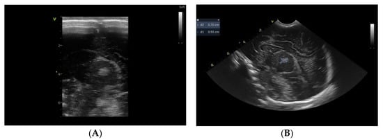 The routine cerebral ultrasound that had been performed on the third day of life did not reveal any pathological findings, but on the eighth day of life, the same examination revealed an abnormal hyperechoic round, homogenous, well-differentiated, unilateral image in the left thalamic region, suggestive of a thalamic infarct; it can be observed in Figure 1A,B. Assessing cerebral blood flow using a Doppler examination showed no abnormality.