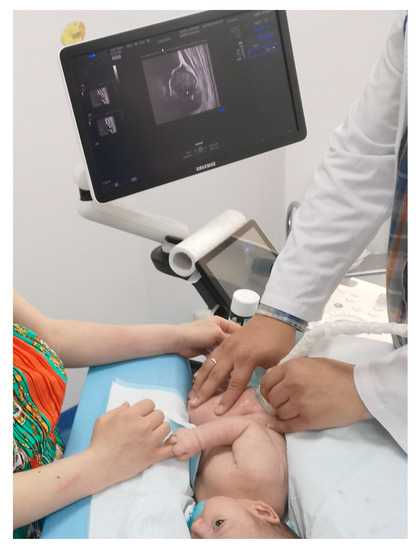 After clinical examination and patient anamnesis regarding pregnancy and delivery, an ultrasound of both hips was carried out. The ultrasound was performed by having the child placed on one side in a special cradle, and measurements were made on the same type of device, using a linear array probe, 7.0 MHz frequency, 270° image rotation, as seen in Figure 2.
