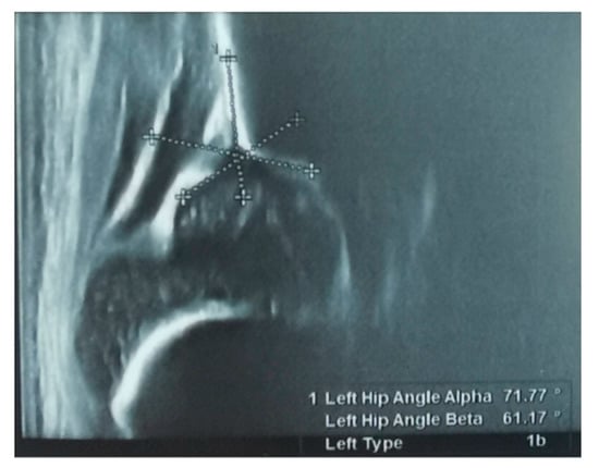 Graf has established the criteria for a normal hip on static ultrasonographic images as follows: a normal alpha angle value of over 60° between the bony acetabulum and the ilium and a beta angle less than 55° measured between the labrum and the turning point from convexity to concavity on the bony rim [8].