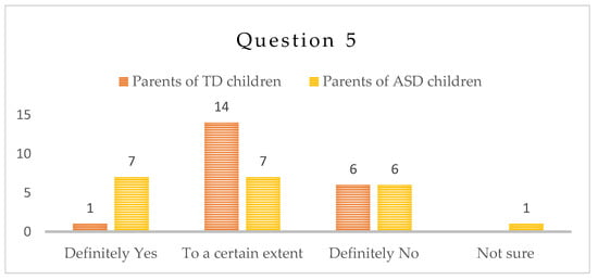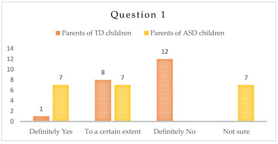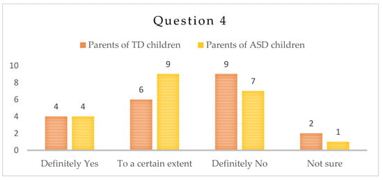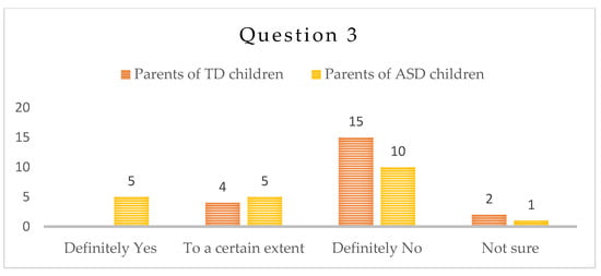 Ten/10/of the parents of children with ASD gave a negative answer to this question, and one was not sure. The rest were equally divided between “Yes” and “To a certain extent”. Parents of typically developing children had answered “No”—fifteen (15), “I am not sure”—two (2), and “To a certain extent”—four (4)—Figure 3.