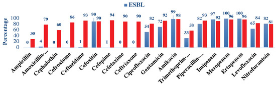 - Abalkhail, A.; AlYami, A.S.; Alrashedi, S.F.; Almushayqih, K.M.; Alslamah, T.; Alsalamah, Y.A.; Elbehiry, A. The Prevalence of Multidrug-Resistant Escherichia coli Producing ESBL among Male and Female Patients with Urinary Tract Infections in Riyadh Region, Saudi Arabia. Healthcare 2022, 10, 1778. [Google Scholar] [CrossRef]
