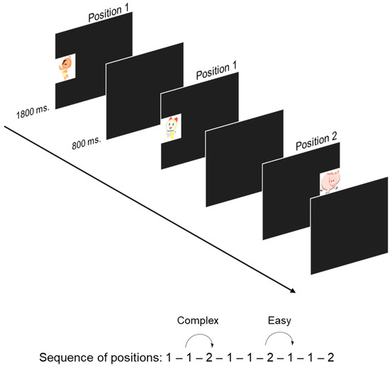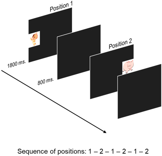A modification of the sequence was introduced in the 9 months version of the task in order to introduce a distinction between easy (unambiguous; context-free) and complex (ambiguous; context-dependent) trials. Again, stimuli were presented in the central left (position 1) and central right side (position 2) of the screen in a fixed sequence (1-1-2 [74]; see Figure 2). Infants were presented a total of 48 trials, with the initial 9 trials being considered as practice trials (18.75% of total trials), while the remaining 39 trials were considered experimental. In this version, position 1 was repeated two times in a row before position 2. This particular sequence (1-1-2) allows us to distinguish between anticipations in which the next stimulus position could be unambiguously predicted (i.e., position 2 is always followed by position 1) or ambiguously predicted (i.e., position 1 could be followed by position 1 if it is the first occurrence in the sequence, or by position 2 if it is the second). For ambiguous trials, infants would be required to engage in context monitoring processes in order to keep track of the previous position to the current one to correctly anticipate the next stimulus location.