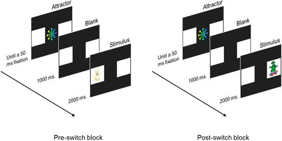 We employed an adaptation of an attention-switching task to evaluate attention flexibility at 6 months of age [75] (see Figure 3). Two white boxes (15° × 15°) were presented at either side of the screen at 9.66° eccentricity to the nearest edge of the box over a black background during the entire trial. Each trial started with a colorful animated attention attractor in the center of the screen coupled with music. After a 50 ms fixation on the attractor, an anticipatory period was introduced, displaying only the two white empty boxes for 1000 ms. Finally, an animated cartoon coupled with a funny sound was presented for 2000 ms in one of the boxes. The task comprises two blocks. In the first block (pre-switch), the same stimulus was always presented on the same box (rewarded location) for a maximum of 18 consecutive trials. In the next block (post-switch), a different stimulus was presented on the opposite box (non-rewarded location in the pre-switch block) for twelve consecutive trials. A minimum of 3 correct anticipations were required before trial 18 in the pre-switch block in order to move to the post-switch block. This was required in order to be certain that the infant generated an expectation of the stimulus presentation side to fairly measure perseverative errors during the post-switch block. Both stimulus location and identity were counterbalanced between participants. The proportion of perseverative anticipations in the post-switch block was computed over the number of total anticipations (both correct and incorrect anticipations) [14] as a measure of attentional flexibility. Additional information concerning the analysis of the task can be found in Supplementary Materials (Section S1.3).
