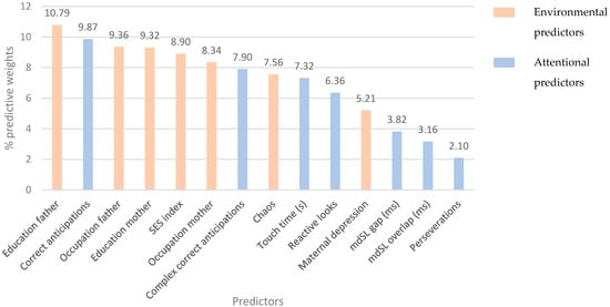 Regarding chaos, early exposure to a disorganized and unpredictable household seems to have a moderate weighting on the prediction of children’s EC levels. Previous studies have found higher levels of chaos to be related to lower EC [77], EF [49], and self-regulated behavior [50]. Our model captures the importance of home chaos, although the increase in the predictive weight of this variable from the environment-only model to the attentional-environment model suggests an important interaction with attentional abilities that also contribute to a better classification.