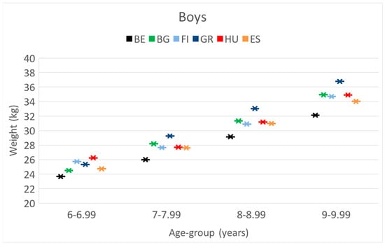 BOYS. Weight. At the age of 6 y, Hungarian boys had the highest body weight, but from 7 to 9 y of age, Greek boys had the highest body weight. Belgian boys had a significantly lower body weight in each cohort, as presented in Table 1.