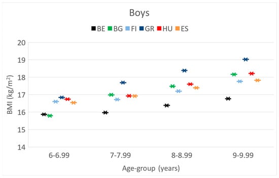BMI. In the age group 6 y, Bulgarian boys had the lowest value, followed by the Belgian, without significant differences. In the older categories (7–9 y), Belgian boys always had the lowest BMI; however, boys in Greece had the highest.