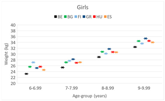 GIRLS. Weight. Greek girls had the highest weight; the Belgian girls had the lowest body weight, which was significantly lower than their Hungarian counterparts. This was found for all age cohorts (see Table 2).