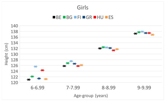 Height. The Finnish girls were the highest in all age categories. Compared to the Hungarians, at 6 years of age, the Belgian, Greek and Spanish girls were significantly smaller, while at 7 y, the Finnish and, at 8 y, the Bulgarians were significantly taller.