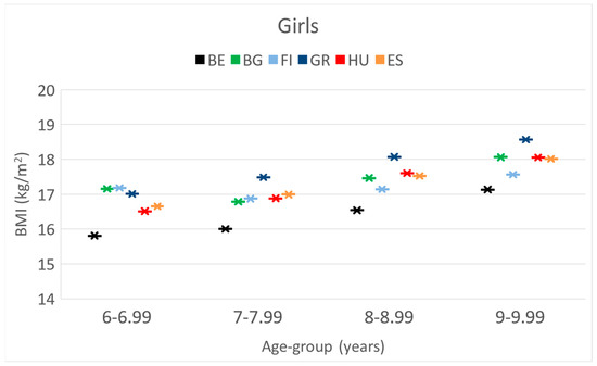 BMI. In the age group of 6 y, there was no significant difference between the countries. In the later age groups, Greek girls always had the highest values, though this was only significant at 9 y. Greek girls had the significantly highest BMI values. In age groups from 7 to 9 y, Belgian girls had the lowest BMI values compared to others.