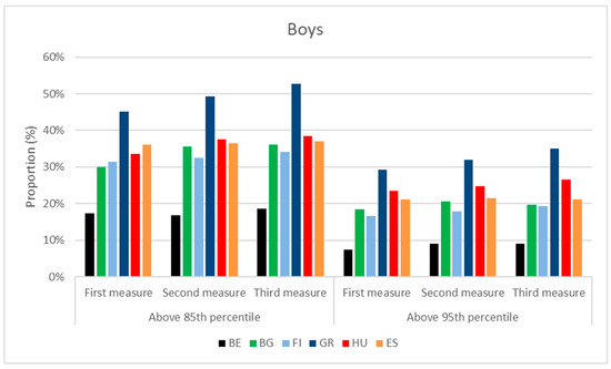 The distribution of overweight and obese children was different in the six countries examined. Greek boys represented the greatest proportion among overweight boys for all age cohorts (45–53%), followed by the Hungarians (34–38%), Spanish boys (36–37%) were the third, Bulgarians (30–36%) were the fourth, Finnish had the fifth position (31–34%), while Belgian boys (17–19%) had the lowest proportion above percentiles of 85.