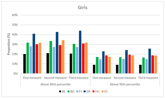 Among the population of girls, the Greeks represented the greatest proportion in the overweight range, depending on the time of measurements; in total, 41–44% of them were above the percentile of 85. The Spanish were in the second position (32–34%), followed by the Bulgarian (31–33%) and Hungarian girls (29–31%), and thereafter Finnish (27–28%) and Belgian girls (20–21%).