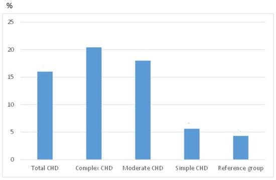 Prevalence of non-swimmers in children with congenital heart defects (CHD) and in the healthy reference group (in percent). Compared to healthy children, the proportion of non-swimmers in children with CHD was significantly higher (16% versus 4.3%; p < 0.001) and was dependent on CHD severity: Children with complex CHD had an almost five-fold increased risk (20.4%), children with moderate CHD a more than four-fold increased risk (18%) of being unable to swim, while in children with simple CHD, the ability to swim did not differ significantly from their healthy reference group (5.6% vs. 4.3% non-swimmers (p = not significant).