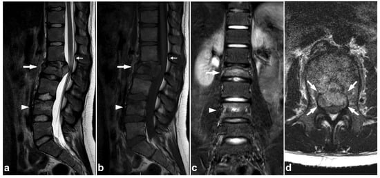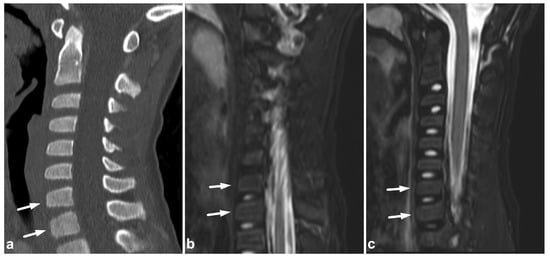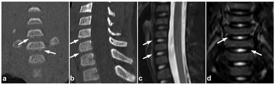 MRI has a high negative predictive value in spinal fractures. Fat-suppressed sequences, particularly short tau inversion recovery (STIR), are the most sensitive in acute trauma []. T1- and T2-weighted sequences help to assess the exact fracture morphology. Novel high-resolution sequences optimized for bony structures improve the accuracy of MRI in fractures. Children are prone to multiple spinal fractures, often at non-contiguous levels. Hence, the inspection must be careful and thorough, even if—and especially if—one fracture is found [,].
