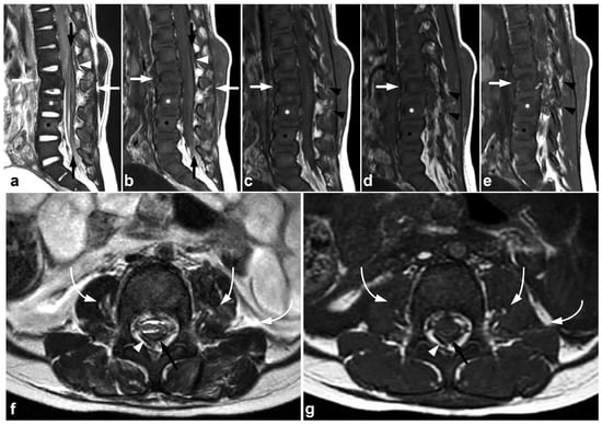 As with any intervertebral disc pathology, acute traumatic disc injuries are best seen with MRI []. The high signal from post-traumatic edema can best be separated from the high physiological signal originating from the nucleus pulposus using fat-suppressed T2-weighted images. Degenerative intervertebral disc changes are not rare in the pediatric population [,,], and these should not be confused with acute discal injury with the edematous signal. Figure 11 demonstrates a solitary acute intervertebral disc injury.
