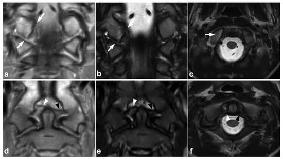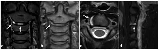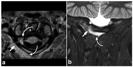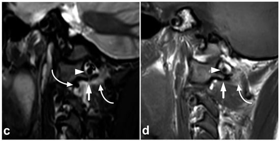 The craniocervical and atlantoaxial joints are mobile structures allowing flexion–extension movement and rotation of the head. The joints’ biomechanics and the importance of different stabilizing structures are not yet completely understood. The joint capsules, the alar ligaments, and the transverse ligaments are crucial to stability [,,]. The role of the tectorial membrane is more controversial, but it might also be of importance in preventing overextension [,]. Injury to the stabilizing joints or ligaments may lead to instability. Isolated soft tissue injuries and avulsion fractures without complete joint dissociation (Figure 4) may occur. All the joints and ligaments mentioned above are visible on MRI. A higher field strength and dedicated proton density- and T2-weighted sequences with a smaller field of view may help to delineate these small structures better []. Figure 8 demonstrates a case with an upper cervical spine ligament injury.