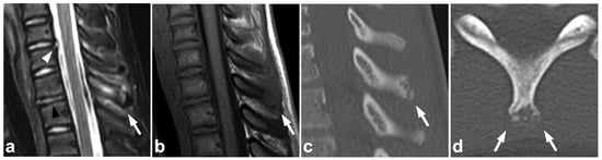 Acute clay-shoveler-type spinous process avulsion fractures are also seen, usually in teenage athletes []. On MRI, chronic stress fractures of the spinous process (sometimes called apophysitis of the spinous process) [,] may have a similar appearance to acute fractures. Chronic spinous process injuries are most abundant in the same type of population as acute fractures, but the symptoms usually follow a more gradual course. Targeted CT of the edematous spinous process helps to separate acute, sharp avulsion fractures from chronic injuries with sclerotic margins and fragmentation (Figure 5).