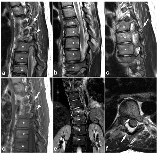 (a) Sagittal left-sided off-midline T2-weighted. (b) Sagittal T2-weighted. (c) Sagittal right-sided off-midline T2-weighted. (d) Sagittal left-sided off-midline T1-weighted. (e) Coronal STIR. (f) Axial T2-weighted (dotted line on the image (c)). A 17-year-old female with a history of idiopathic juvenile scoliosis and acute spinal trauma due to a motorcycle accident. The patient had fractures and contusions in multiple vertebrae; the injuries in Th6, Th7, Th8, Th9, and Th10 (asterisks) are seen in the presented images. In addition to vertebral body fractures, the posterior elements were involved bilaterally in Th6 (arrows) and on the left side in Th7 (arrowhead). Facet joints remained congruent. Burst-like morphology is seen on the Th6 fracture. In image (b), the fracture seems to dislocate the spinal cord, but in the axial plane (not presented here), the cord was seen not to be compressed.