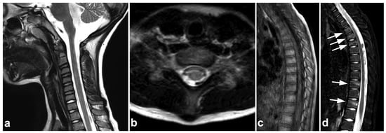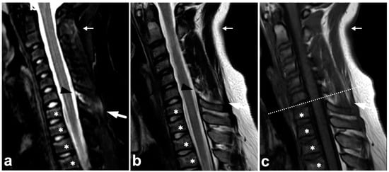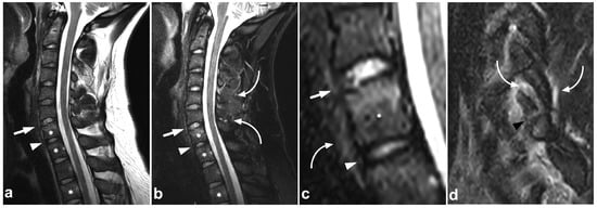 The use of MRI in acute spinal cord trauma was first described in 1983 [,] and it has been the gold standard in imaging these injuries ever since. T1-weighted, T2-weighted, and STIR sequences are the cornerstones in assessing the cord []. Diffusion-weighted imaging (DWI) and diffusion tensor imaging (DTI) might be useful in detecting subtle injuries and as a prognostic biomarker, but their role in clinical practice is not fully established yet [,,,,]. Susceptibility-weighted imaging (SWI) or T2*-weighted sequences might increase the sensitivity in the case of small intramedullary hemorrhages but are technically challenging to obtain due to pulsation and motion artifacts [,]. Cases of spinal cord injuries are presented in Figure 15 and Figure 16.