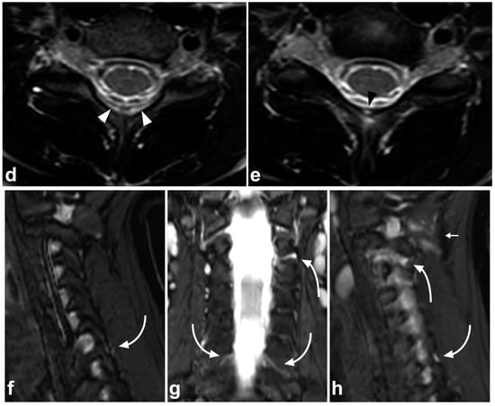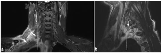 Treatment planning in nerve plexus injuries requires dedicated imaging [,]. However, in a trauma patient with neurological symptoms in the extremities, the emergency spinal MRI can be extended to immediately confirm or exclude a possible nerve plexus injury (Figure 13). If the dedicated neurography sequences are unavailable, routine fat-suppressed T2-weighted imaging provides good sensitivity in plexus injury detection [].