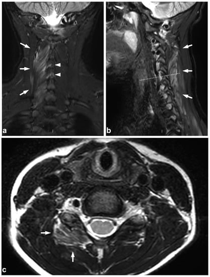 (a) Coronal STIR. (b) Sagittal STIR, off-midline right-sided image. (c) Axial T2-weighted, level C6 (dotted line in the image (b)). A 12-year-old male, cervical flexion injury in a trampoline accident. MRI demonstrates right-sided grade 1 muscle injury (white arrows) in the following muscles: rotatores, multifidus cervicis, interspinales, spinalis, and semispinalis. A minor edematous strain of the interspinous ligaments is seen at levels C5/6 and C6/7 (arrowheads).